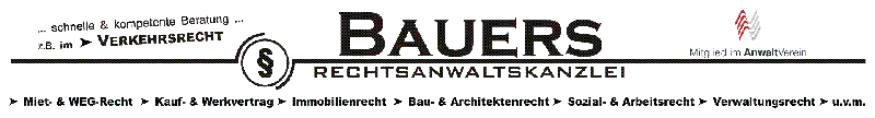 Daneben hat Herr Bauers aber auch entsprechende Fachkenntnis im Bereich des VERKEHRSRECHT, des VERWALTUNGSRECHT, des SOZIALRECHTS, Kauf- und Werkvertragsrechts, Wasserverbands- und Deichverbandsrecht sowie letzlich im Vereins- und Parteirecht.